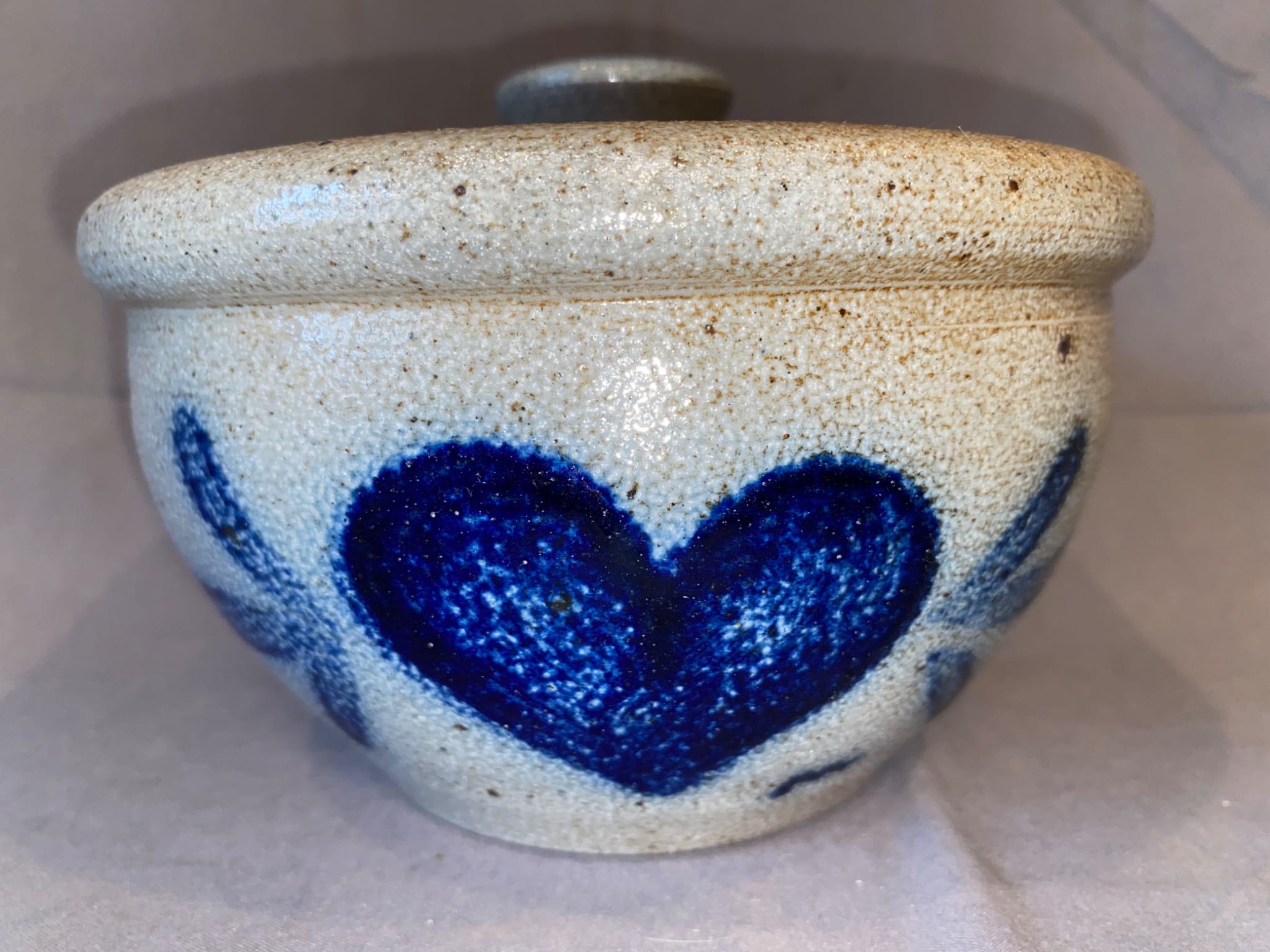 116 Stoneware Crock With Heart Motif and Lid 3.5”H