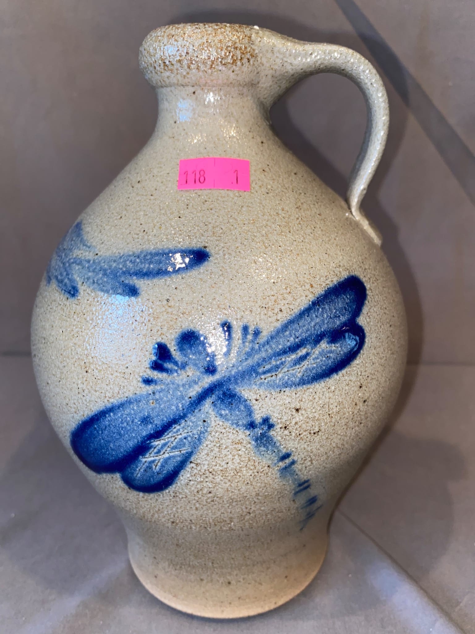 118 Stoneware Jug with Blue Dragonfly Motif by Rowe Pottery Works 8”H