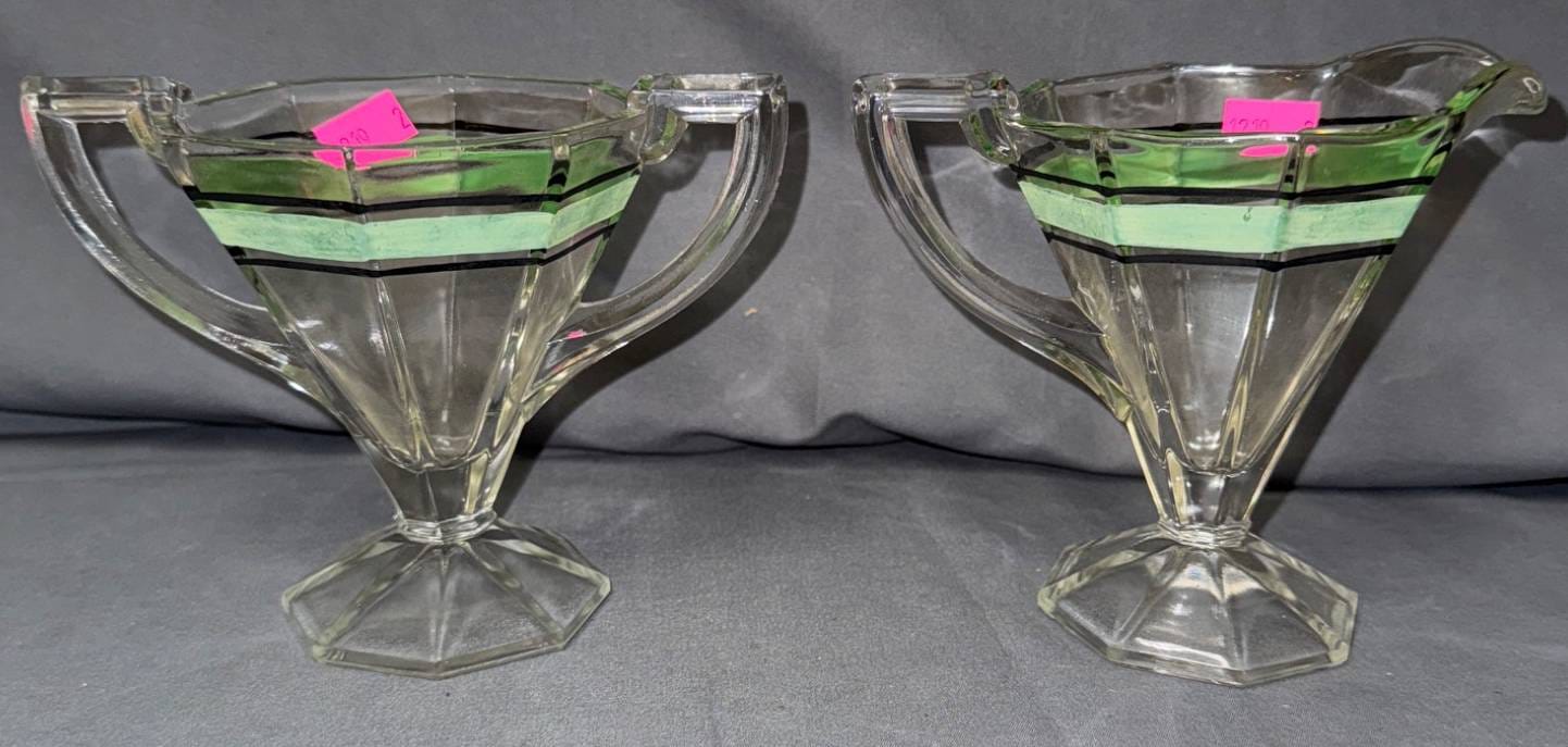 1219 Clear Glass Cream and Sugar Bowl with Green Accents 4.5?x4? Each