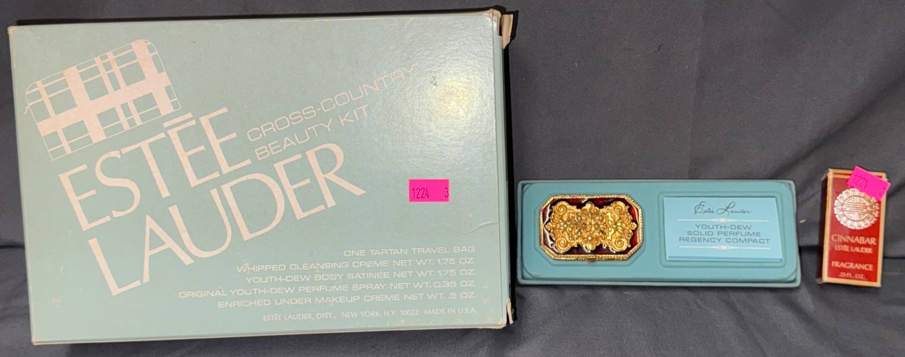 1224 Estée Lauder Youth-Dew Compact, Cinnabar Fragrance and Cosmetic Bags Set