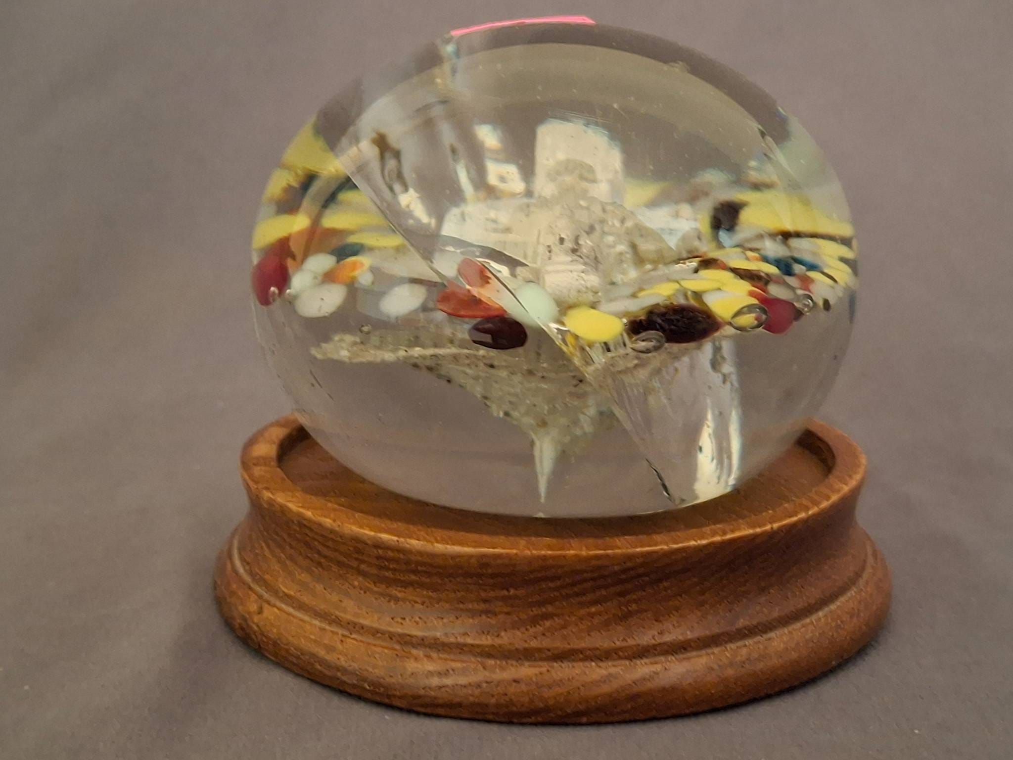 1242 Glass Paperweight with Multi-Color Inclusions and Cross Motif on Wood Base