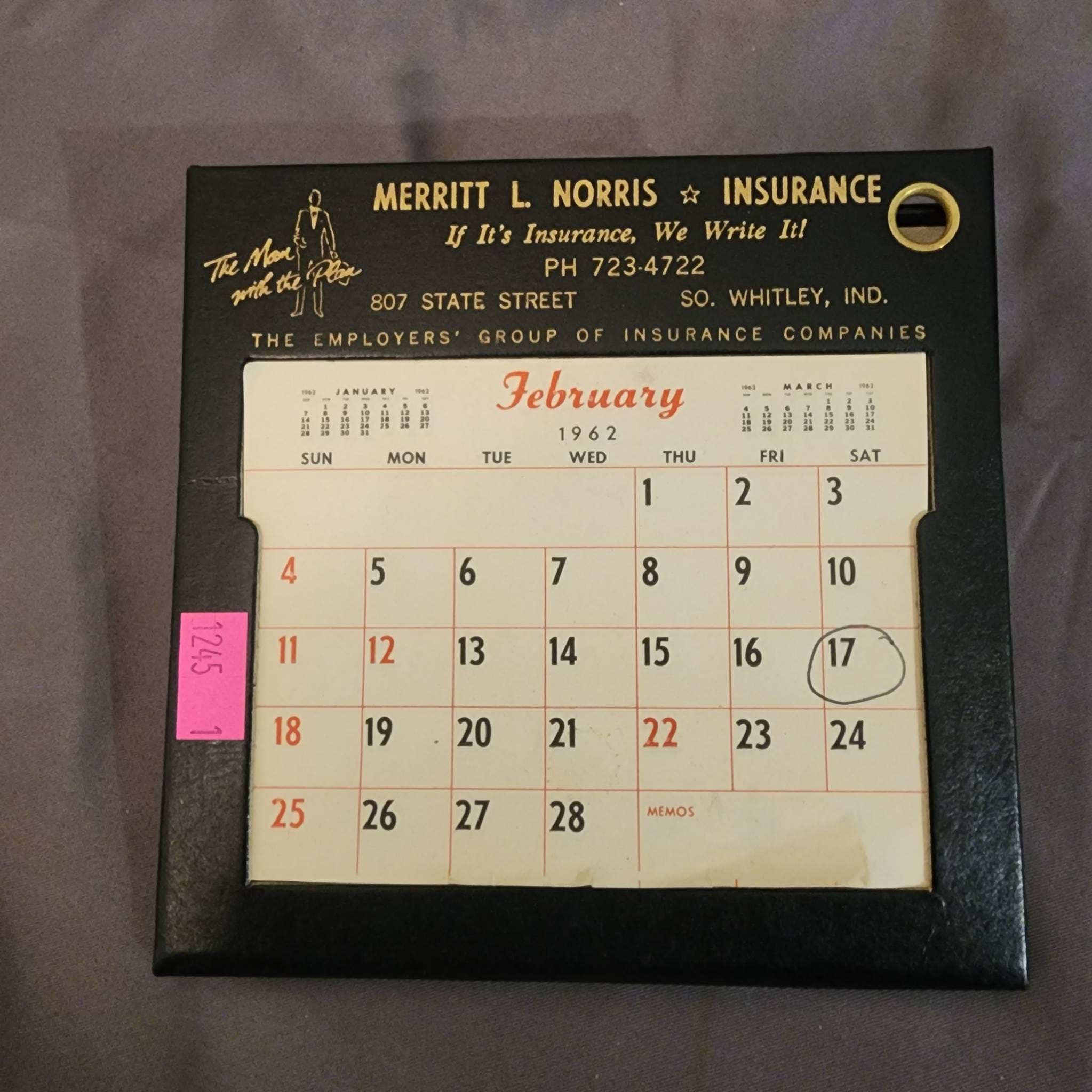1245 1962 Merritt L. Norris Insurance Calendar with Emergency Contact Pad