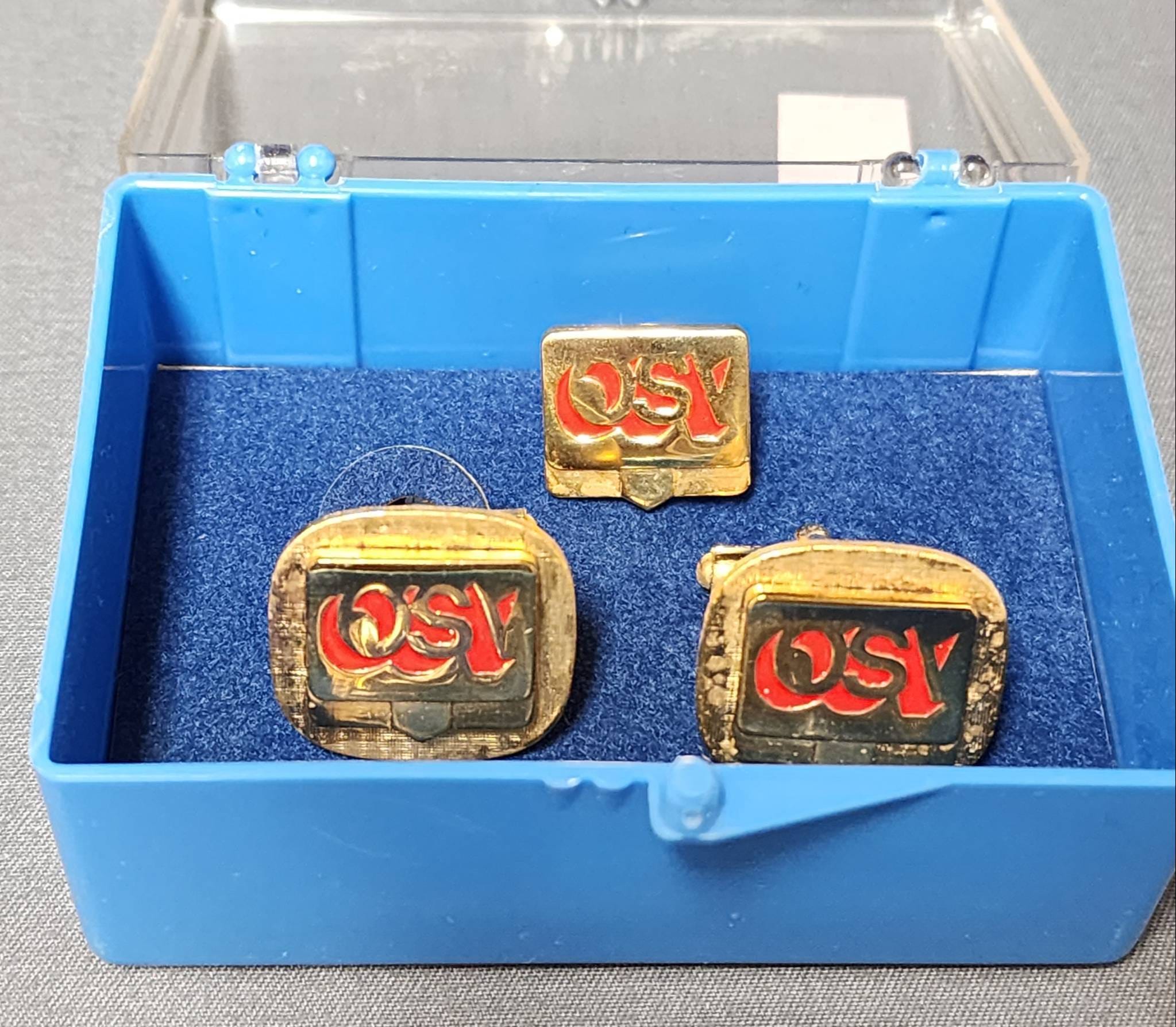 1257 Gold-Tone OSV Cufflinks and Tie Tack Set with Red Enamel Detailing