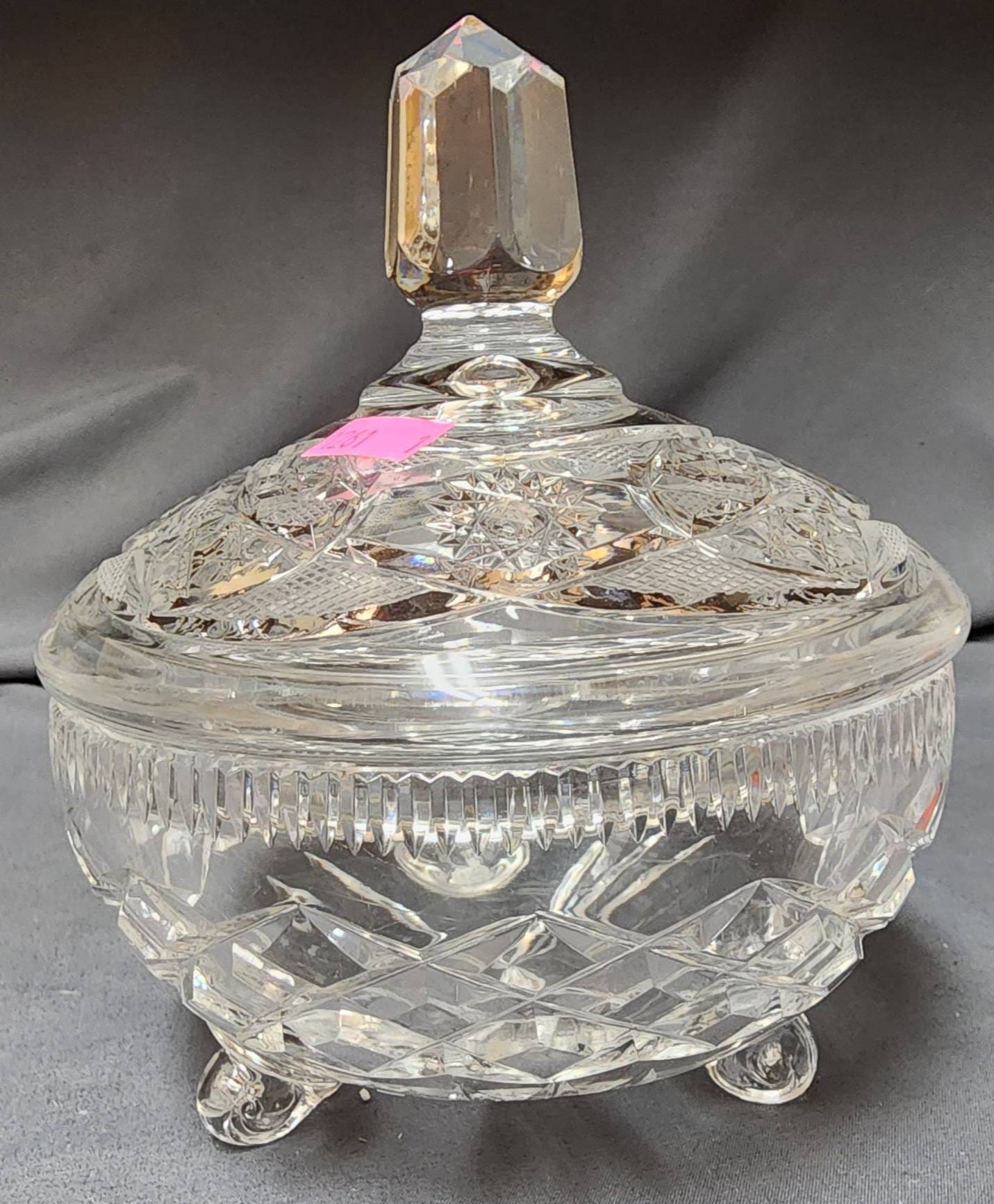 1261 Cut Glass Lidded Candy Dish with Footed Base and Geometric Pattern