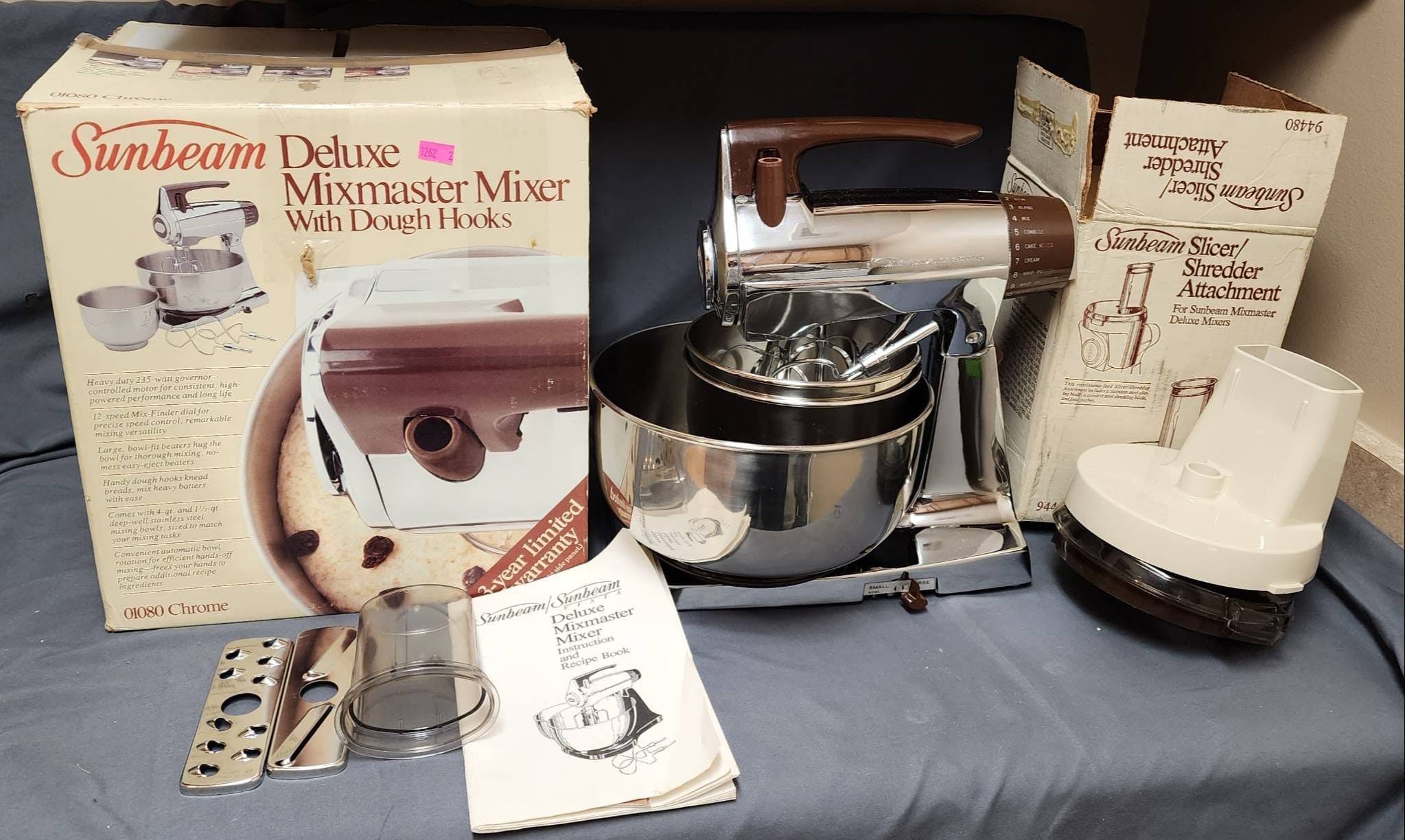 1262 Sunbeam Deluxe Mixmaster Mixer 01080 with Attachments and Manuals