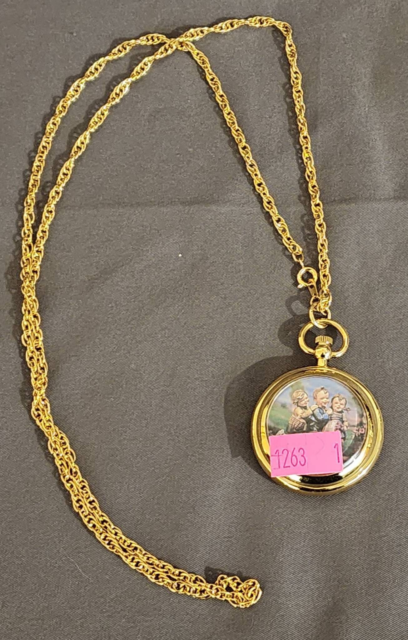 1263 M.I. Hummel Gold-Tone Pocket Watch with Chain and Enamel Artwork