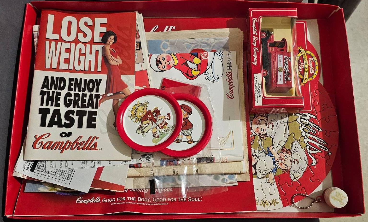 1293 Campbell’s-Themed Memorabilia Set with Puzzle, Toy Truck, Coasters and Ephemera
