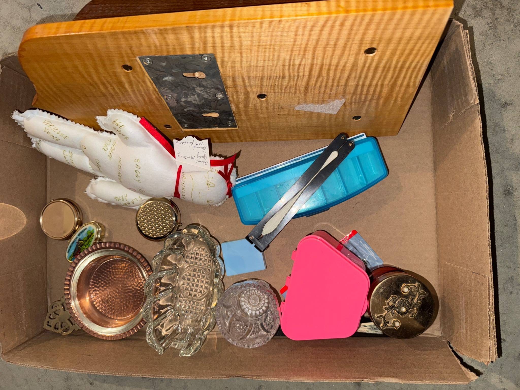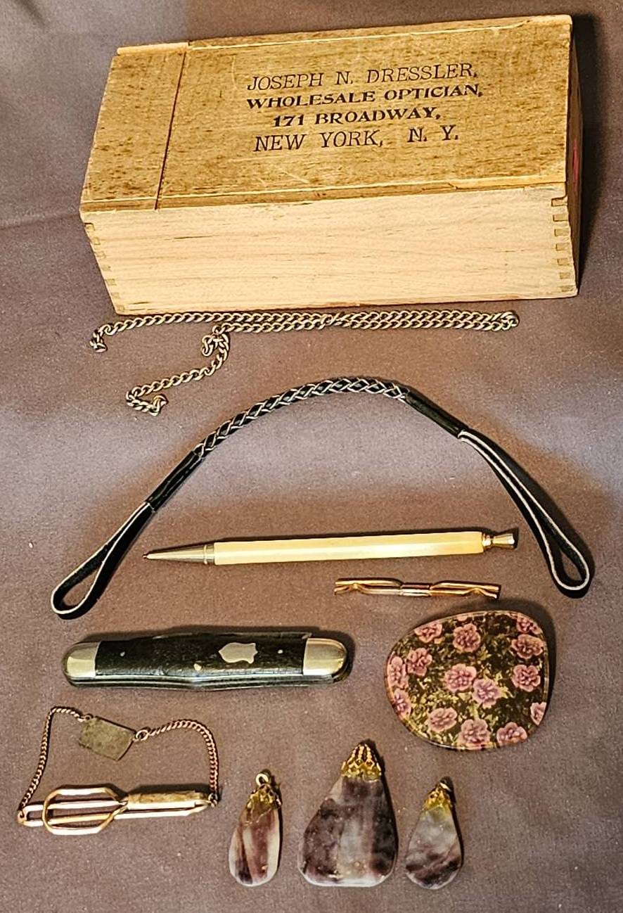 409 Wood Box with Optician Branding and Assorted Items Including Knife and Jewelry 6? x 3?