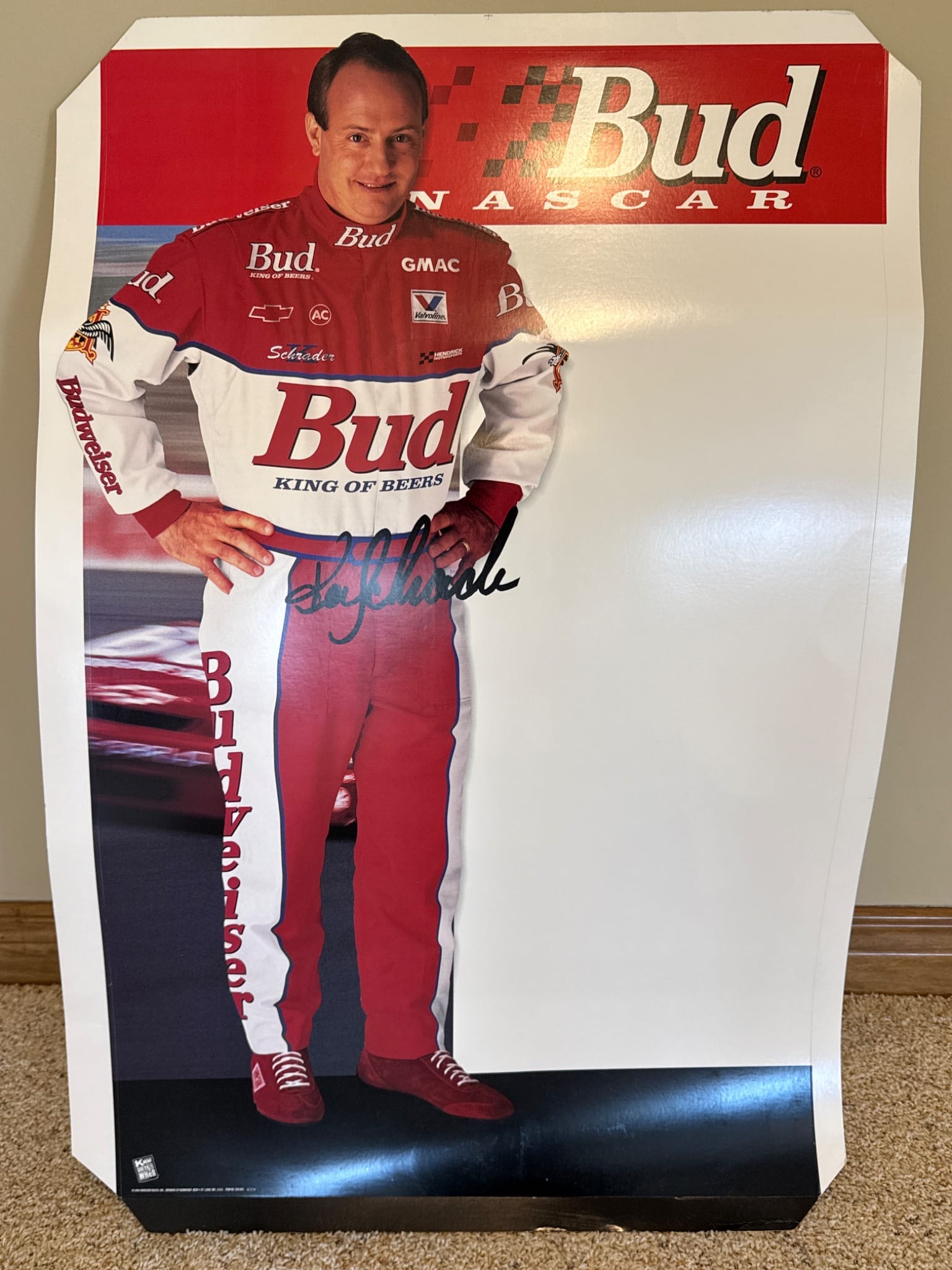 1298 Budweiser NASCAR Standee Featuring Driver with Signature, 37.5”x25”