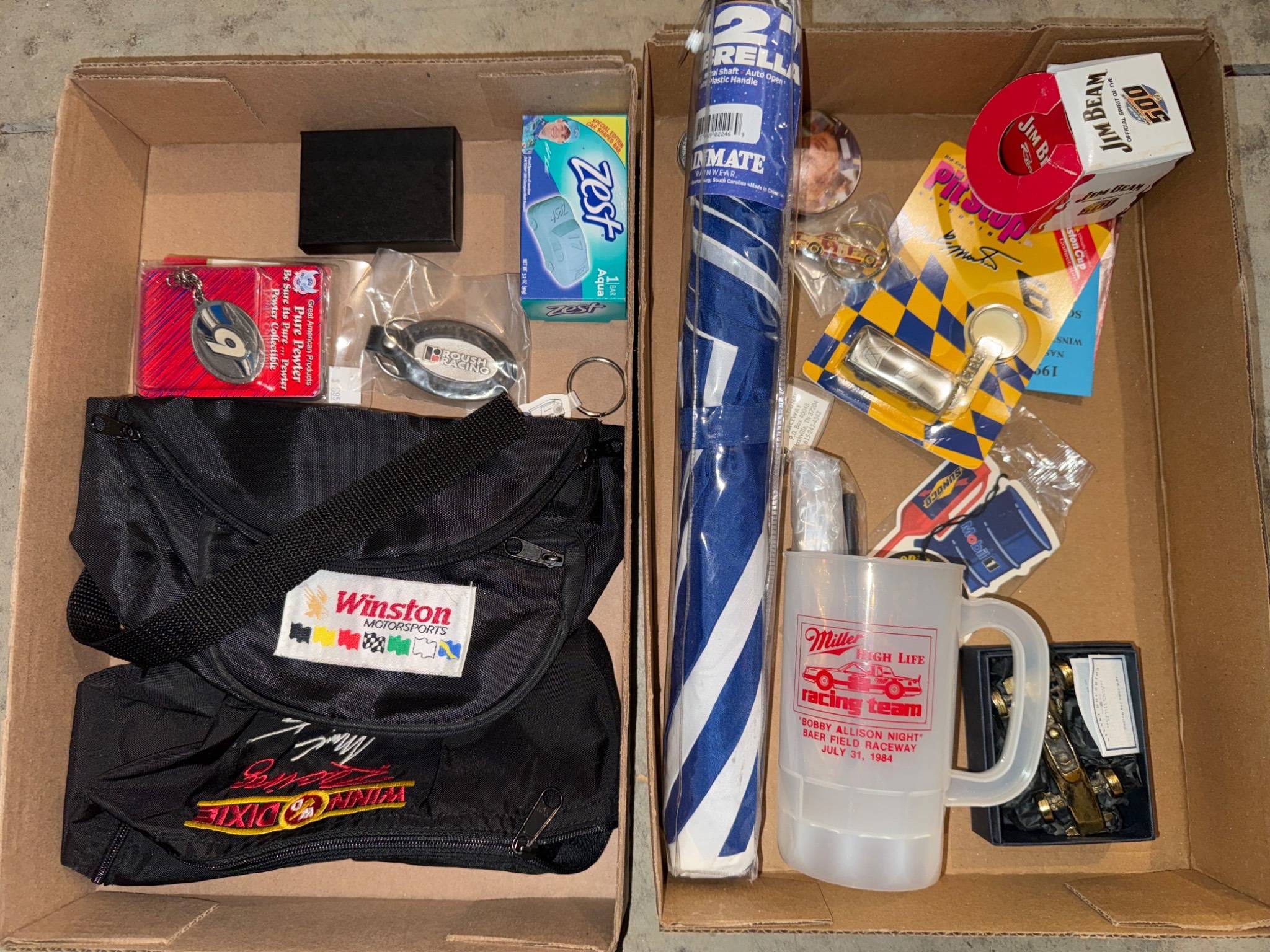 1299 Assorted Racing Memorabilia Including Umbrella, Keychains, Mug, and Commemorative Items