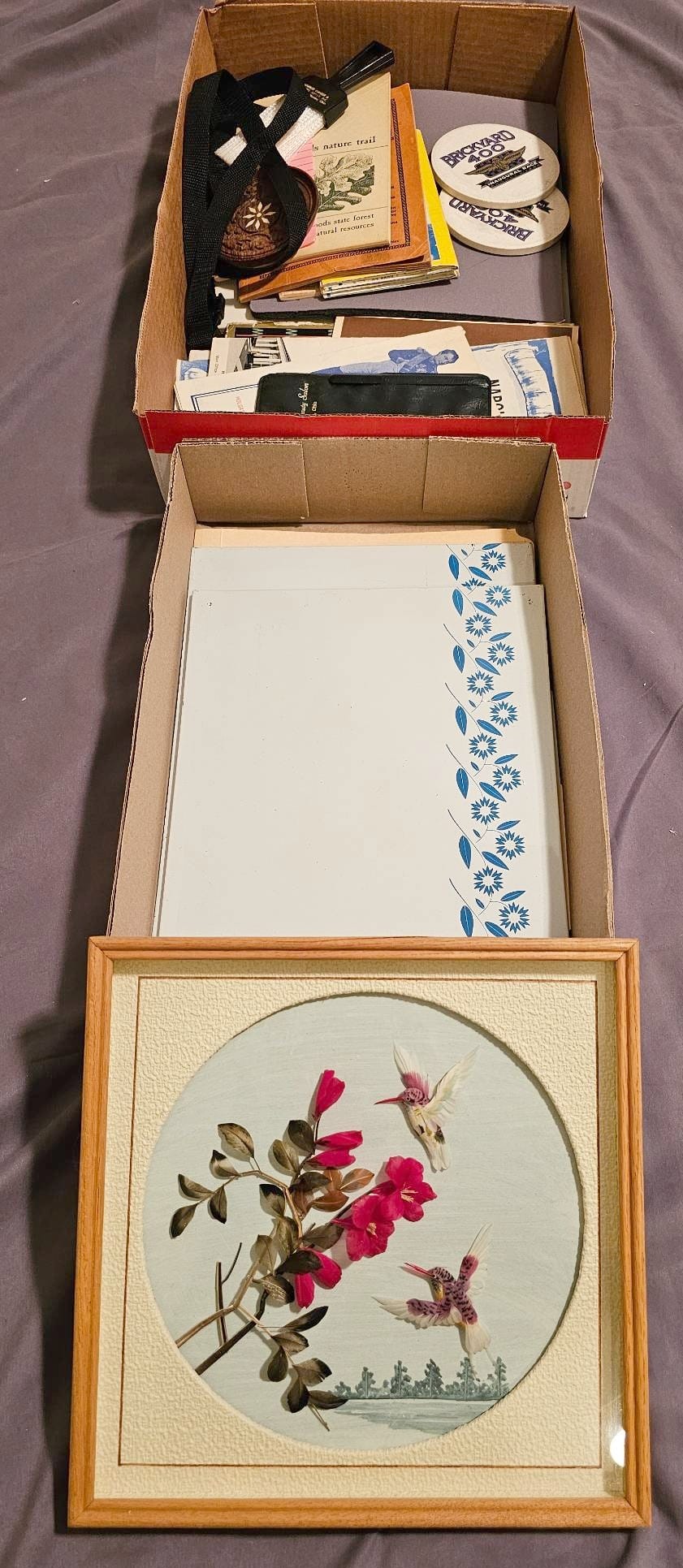 305 Framed Floral Embroidery and Assorted Paper Ephemera