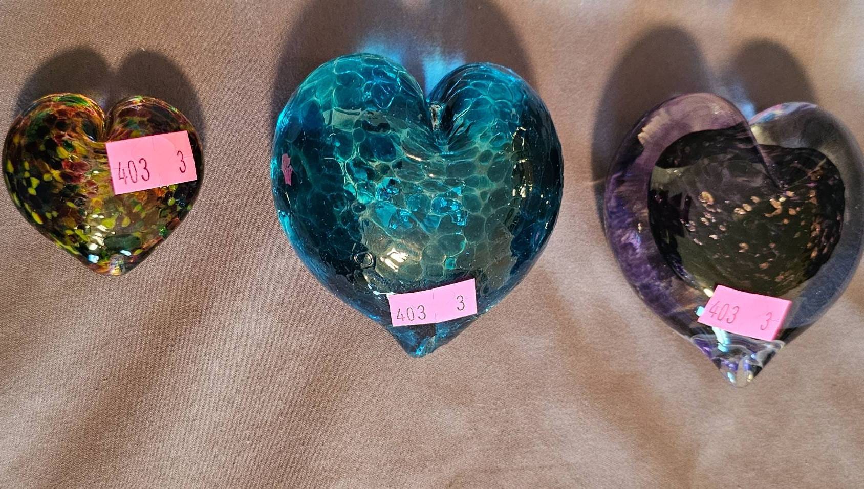 403 Three Handcrafted Glass Heart Paperweights in Assorted Colors and Patterns