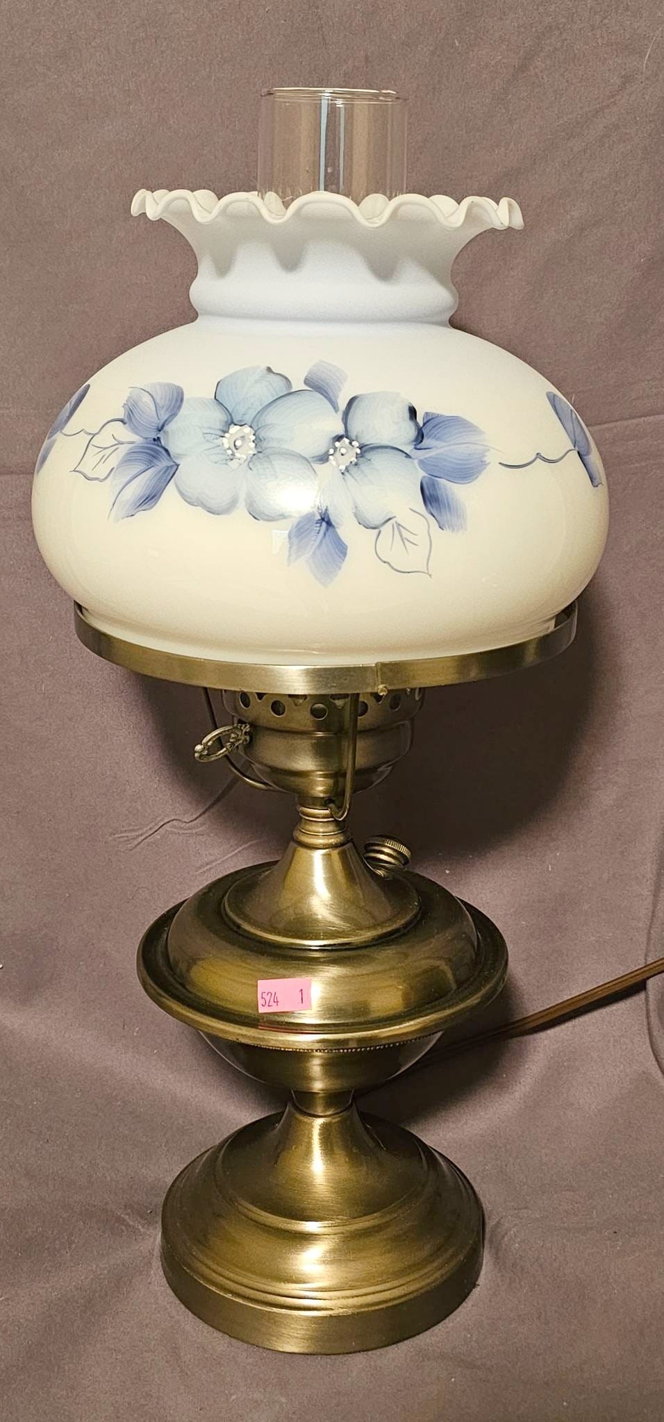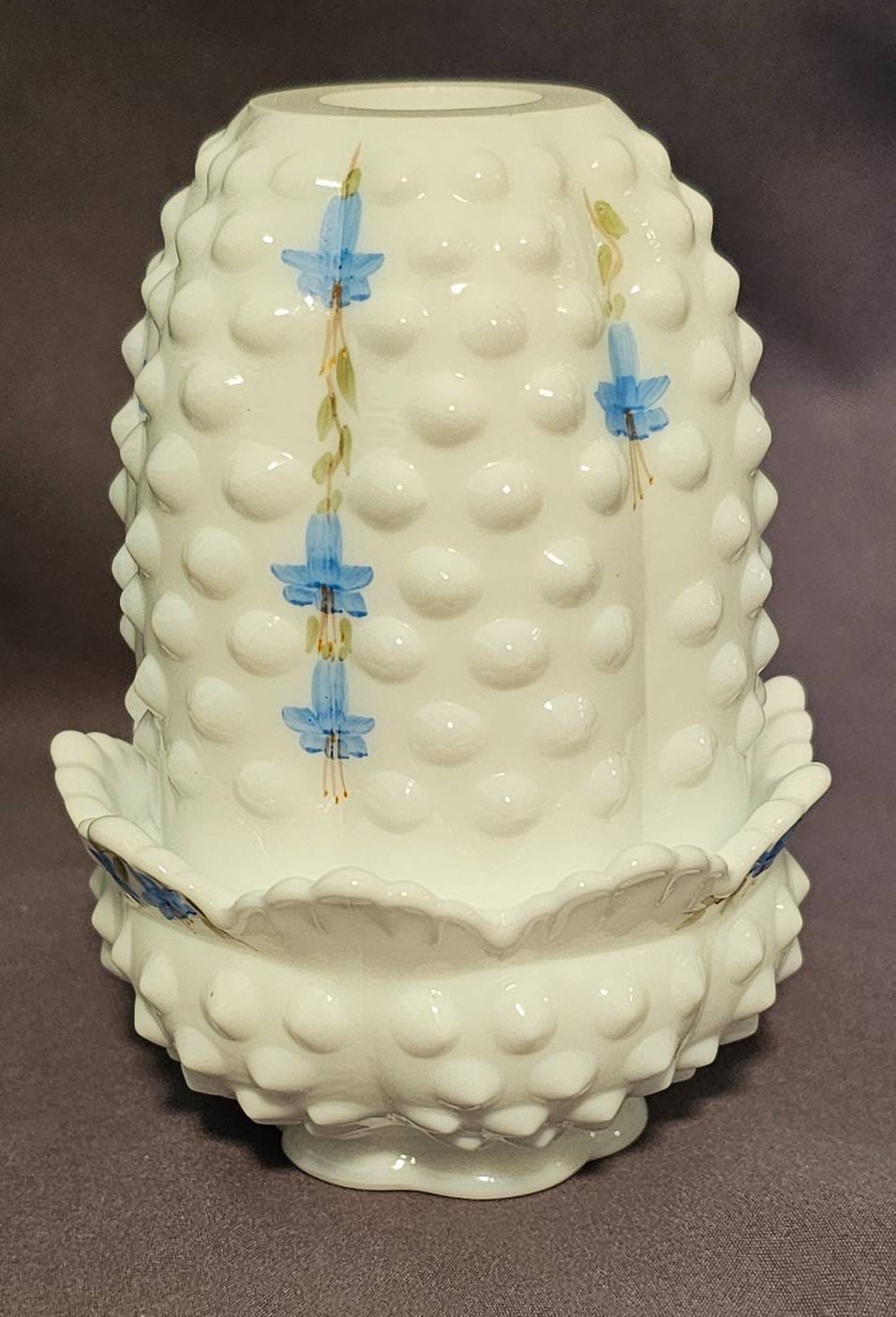 405 Hobnail Milk Glass Two-Piece Fairy Lamp with Blue Floral Design