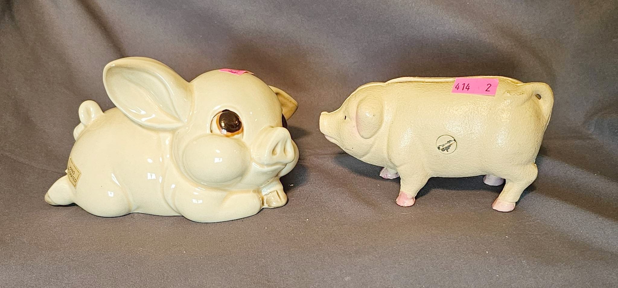 414 Porcelain Pig Figurine and Painted Cast Iron Piggy Bank