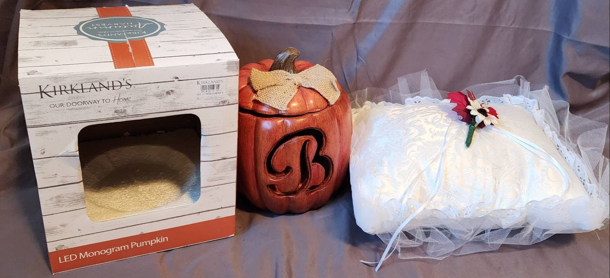 501 LED Monogram Pumpkin and Decorative Pillow with Flower Detail