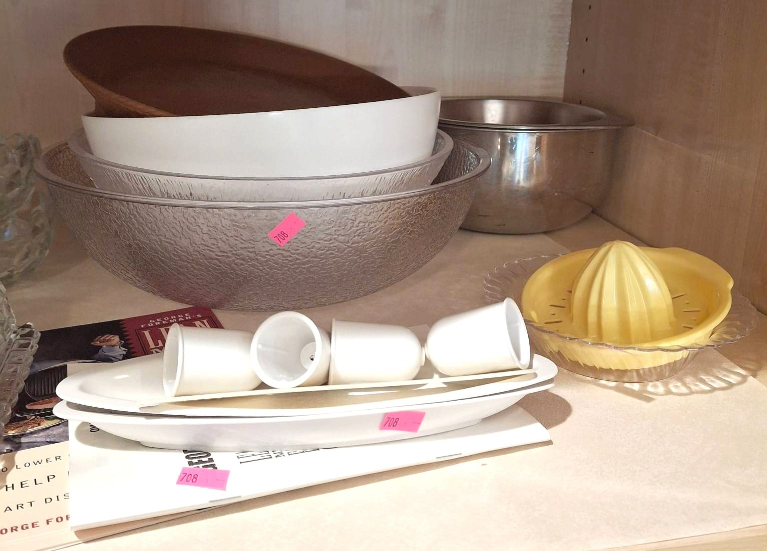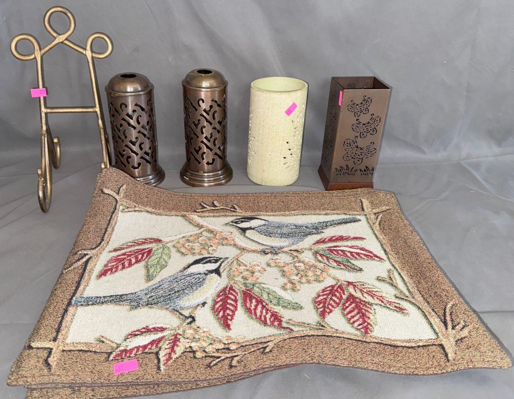 1294 Mixed Items Including Glassware, Copper Dish, Folding Fans, and Embroidered Doll