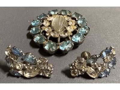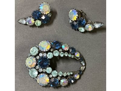 77 Blue and Clear Rhinestone Brooch with Matching Clip-On Earrings