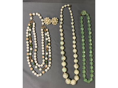 723 Three-Strand Cream & Green Beaded Necklace with Matching Clip-On Earrings
