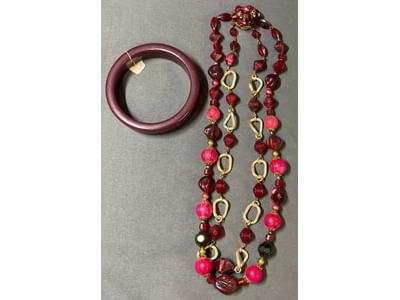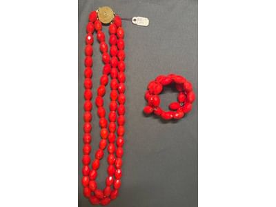 680 Gold-Tone and Red Bead Necklace with Red Bakelite Bangle Bracelet