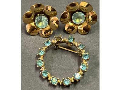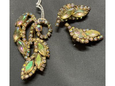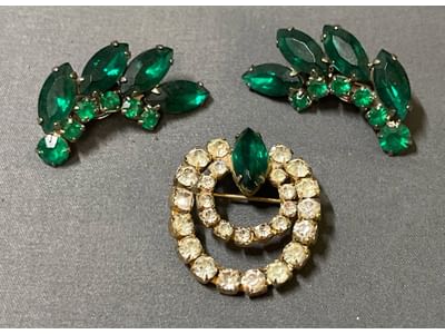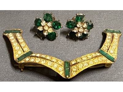32 Rhinestone Brooch and Screw-Back Earrings Featuring Green and Clear Stones