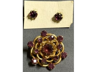 79 Gold-Tone Floral Brooch and Screw-Back Earrings with Purple Stone Accents
