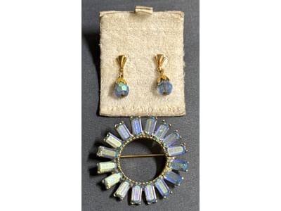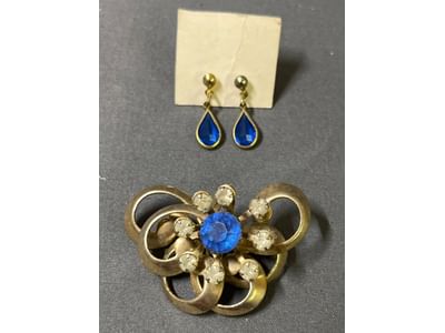 6 Gold-Tone Rhinestone Brooch and Earrings Set with Blue and Clear Stones