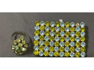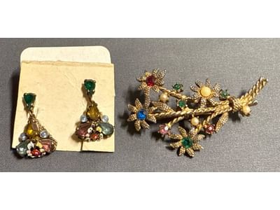 12 Gold-Toned Brooch and Earring Set with Green and Clear Stones
