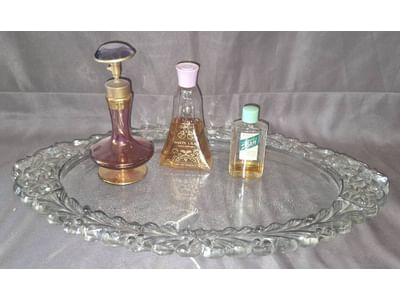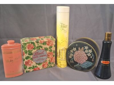 43 Cosmetic Containers Including Old South Powder Sachet, House of Stuart Powder, and Avon Perfume