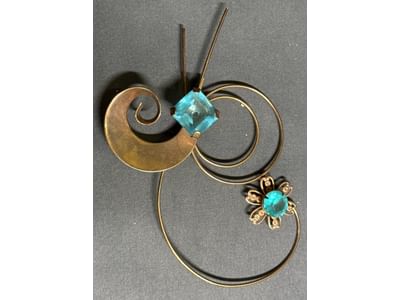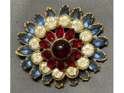 9 Gold-Tone Brooch with Blue and Green Rhinestones, 2-inch Diameter