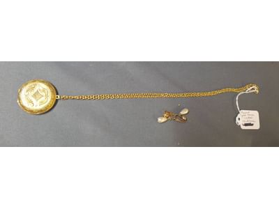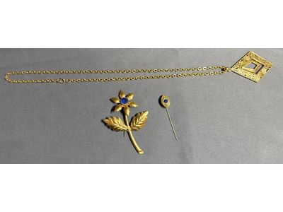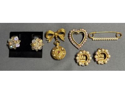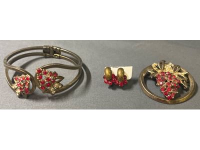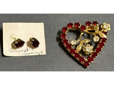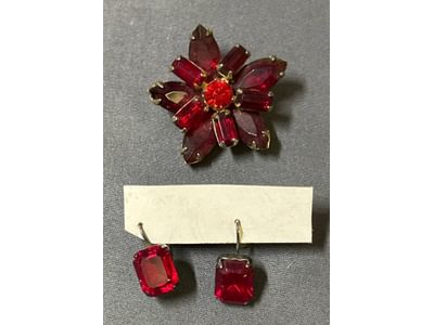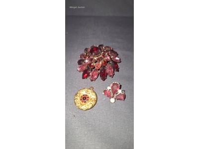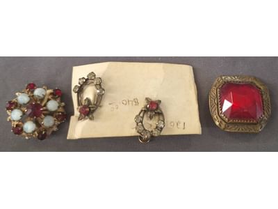 704 Gold-Tone Locket, Red Rhinestone Brooch, and Pin with Red Stones