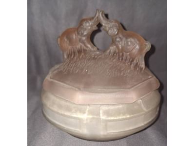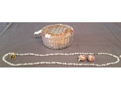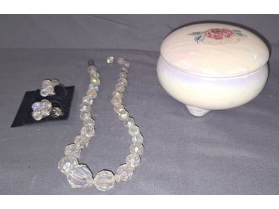 707 Iridescent Lidded Porcelain Dish and Plastic Crystal Like Bead Jewelry Necklace and Clip-On Earring Set