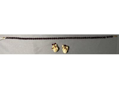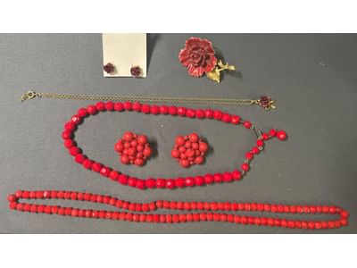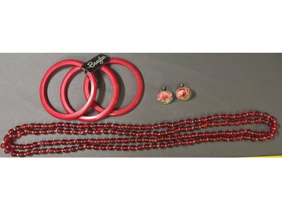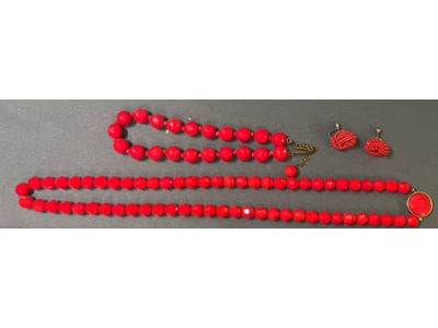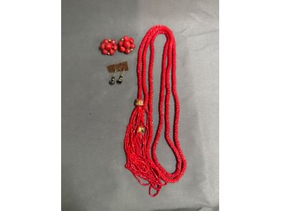 727 Red Beaded Necklace, Clip-On Earrings, and Black Drop Earrings