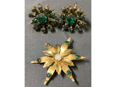 35 Gold-Tone Starburst Brooch and Clip-On Coro Earrings with Green and White Stones