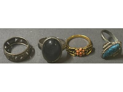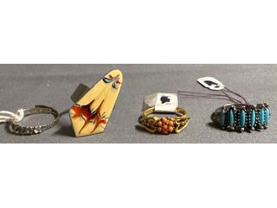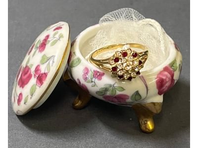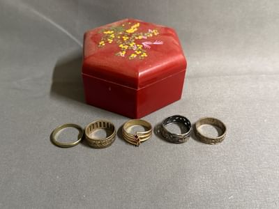 745 Five Gold-Tone Rings with Red Floral Lacquer Box