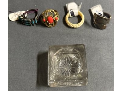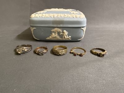 746 5 Rings Featuring Red and Clear Stones Accompanied by A Wedgwood Blue and White Jasperware Box