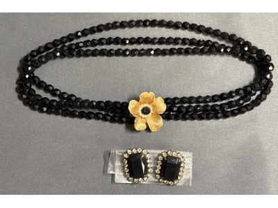 687 Black Glass Beaded Necklace with Flower Clasp and Coordinating Dangle Earrings