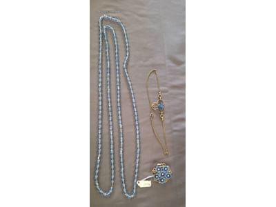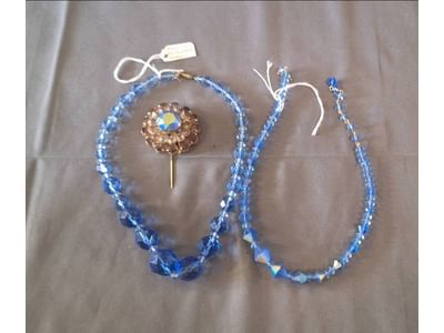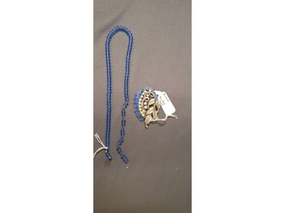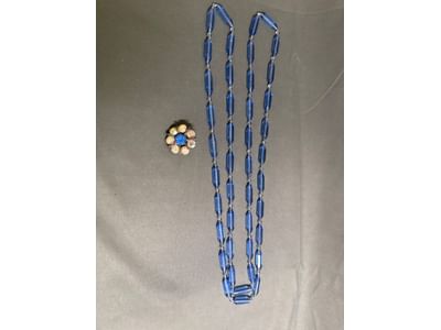 732 Blue Glass Bead Necklace and Rhinestone Flower Brooch