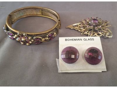 686 Gold-Tone Necklace, Bracelet, and Brooch Set with Purple and Clear Stones