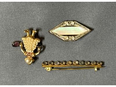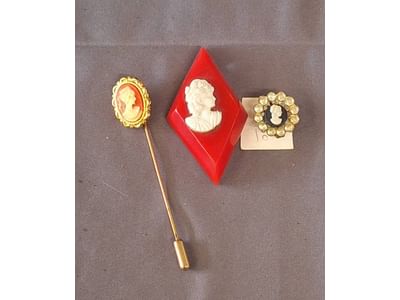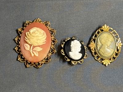 696 Three Jewelry Pins Featuring Cameo, Gemstone, and Filigree Designs