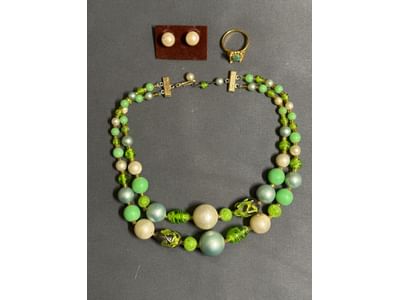 685 Green and Pearl like Beaded Necklace, Faux Pearl Stud Earrings, and Gold-Tone Ring with Green Stone