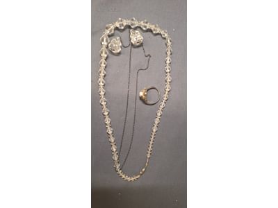 726 Plastic Crystal-Like Bead Necklace with Chain and Filigree Ring Featuring White Center Stone