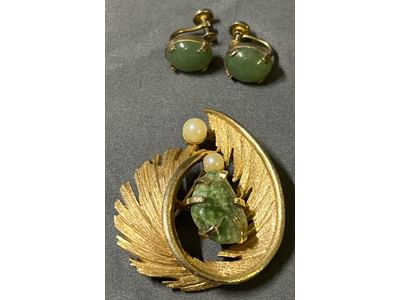 20 Ronci 2K GF Jade Screw-Back Earrings and Gold-Tone Leaf-Shaped Brooch
