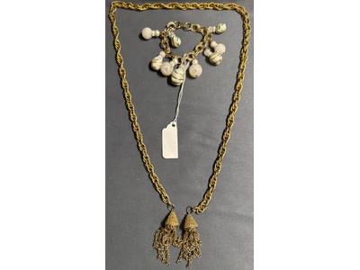 87 Gold-Tone Chain Necklace with Tassels and Bracelet with Glass Bead Charms