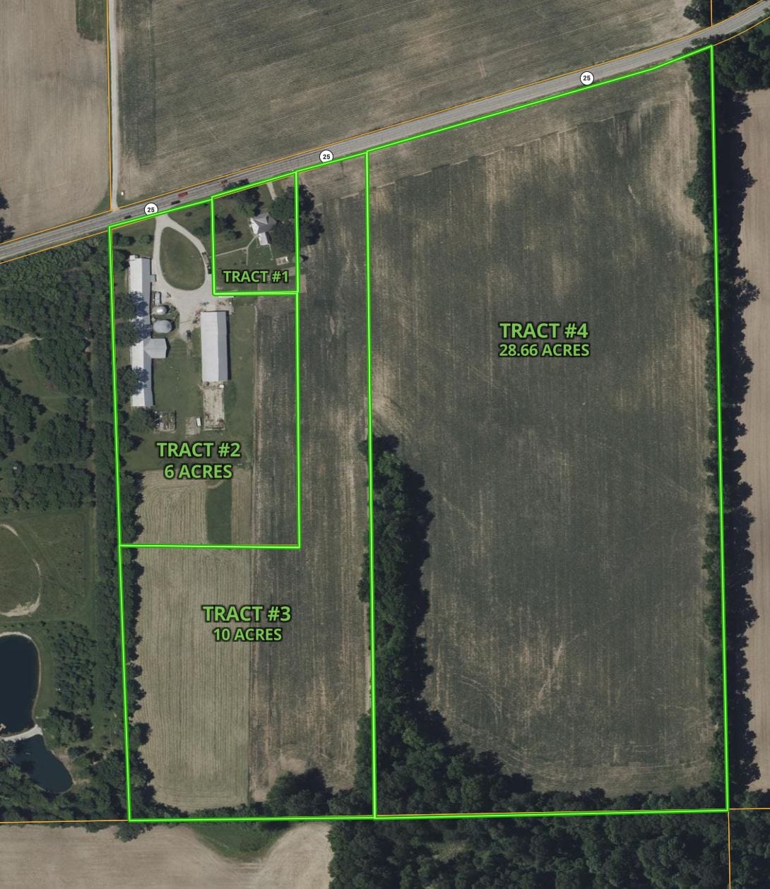 45.66+/- ACRES WITH COUNTRY HOME, OUTBUILDINGS, WOODS, & QUALITY CROPLAND OFFERED IN 4 TRACTS!