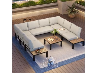 311003 PHI VILLA - Rattan 9 Seat 8-Piece Outdoor Patio Metal Conversation Set with Beige Cushions, Swivel Chairs and Fire Pit Table - SEE DETAILS