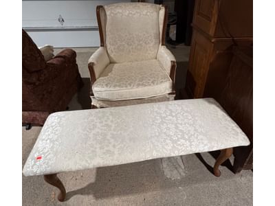 550001 Upholstered Bench and Cream Armchair with Cabriole Legs, Bench, Armchair, 44”x16”x17”, 38”x25”x24”