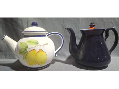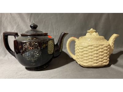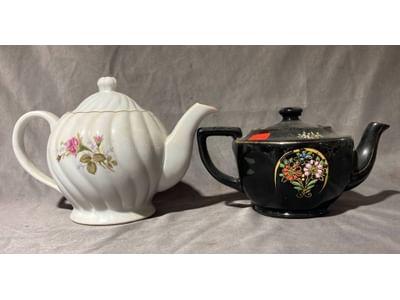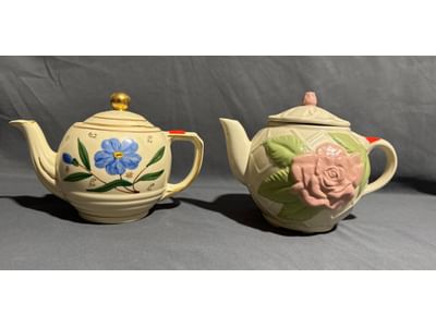 6000 (2) Hall Pottery Teapot with Blue Floral Motif and Teleflora Style Rose Teapot, 5” & 5.5”