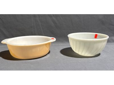 6002 Fire King Peach Lusterware Casserole Dish and Fire King White Swirl Milk Glass Mixing Bowl