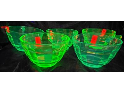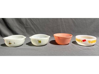 6003 Fire King Anchor Hocking Comic Bowls, Hazel Atlas Bowl and Glasbake Ovenware Yellow Daisy Dish, 2”x5”, 2”x5”, 2.5”x5”