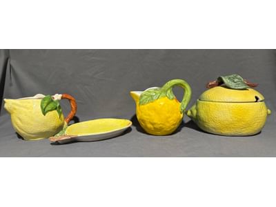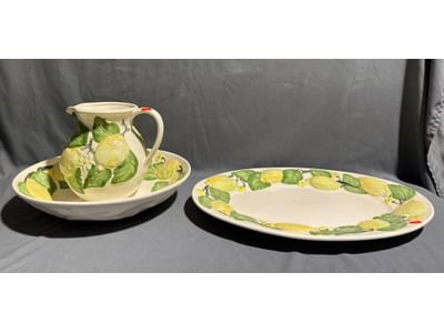 6005 Hand-Painted Pitcher, Bowl, and Serving Platter with Lemon Design, Marked Santos, Portugal, 8”x6”, 14”x9”, 20”